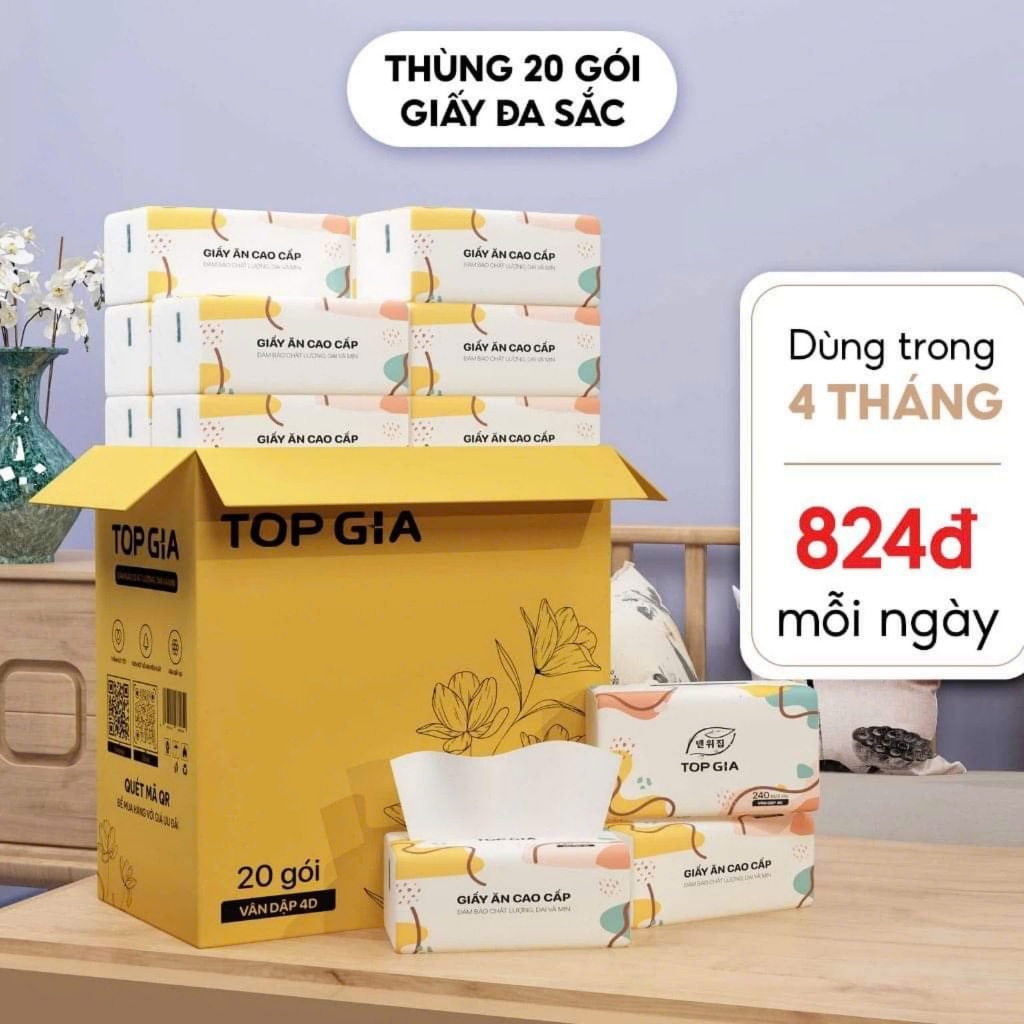 👉 Đặt mua ngay Thùng 20 gói Giấy ăn Đa sắc cao cấp Top Gia để nhận ưu đãi và bảo vệ sức khỏe gia đình bạn ngay hôm nay!